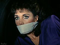 Keywords: tape gag, rope, leather straps, hands to chair arms, hands in front, ankles together, dress, barefoot, uSA