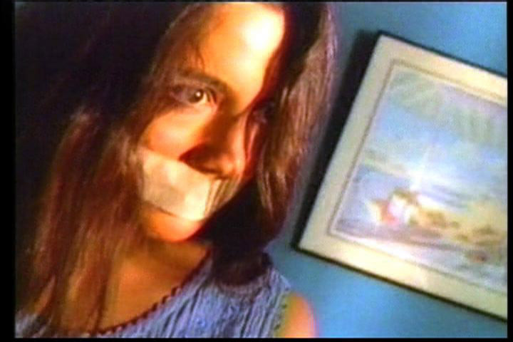 Keywords: handgag, cleave gag, rope, handcuffs, hands in front, hands to chair arms, ankles together, onscreen gagging, onscreen tying, carrying, dress, barefoot, snuff, USA